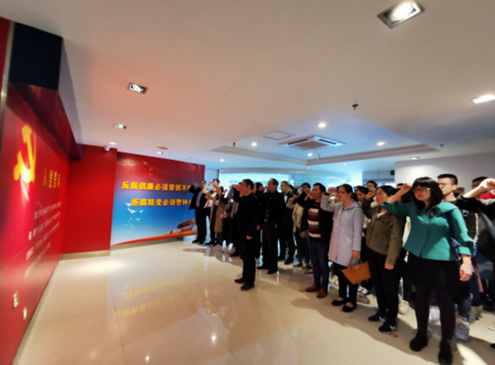 进入教育展厅,首先印入眼帘的是一面“百廉墙”,墙上99种书法字体书写的“廉”字和介绍短片,给人一种“抬头有标识、耳畔有警示”的震撼感。随后,展厅讲解员以图文并茂的形式和现代展陈的手段,对英明决策、党性教育、风范人物、纪检监察工作、预防职务犯罪、警钟长鸣、展望未来七个展览版块做了详细介绍。全体党员认真聆听讲解员现场讲解、阅读廉政箴言故事,观看示范教育展板和典型案例介绍,重温了党中央几代领导人关于党风廉政建设的重要论述。展厅里一系列震人心魄的真实案例,让同志们经历了一场深刻的思想政治洗礼。