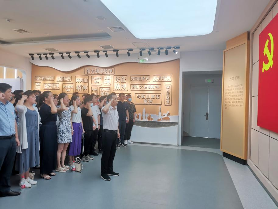 党委书记凤杰带领全体新发展党员宣誓,老党员重温入党誓词,面向党旗宣誓,重忆入党初心,重新接受党性洗礼。活动结束后,党员们深受感动、备受鼓舞,纷纷表示要向先进模范看齐,以实际行动迎接党的二十大胜利召开。