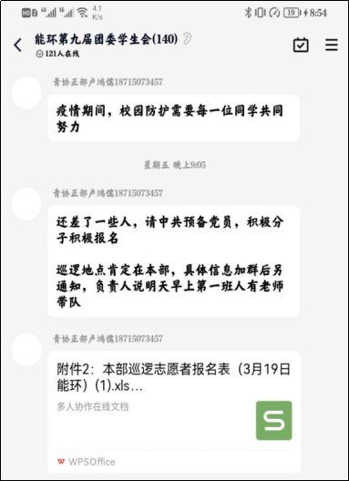 青协卢鸿儒同学在学生里招募志愿者时说道:“疫情期间,校园防护需要每一位同学共同努力!”学院把党员先锋示范岗设立在办公楼下,严格落实体温检测、消毒杀菌的进入措施,成为了学生党员踊跃报名的新“焦点”。