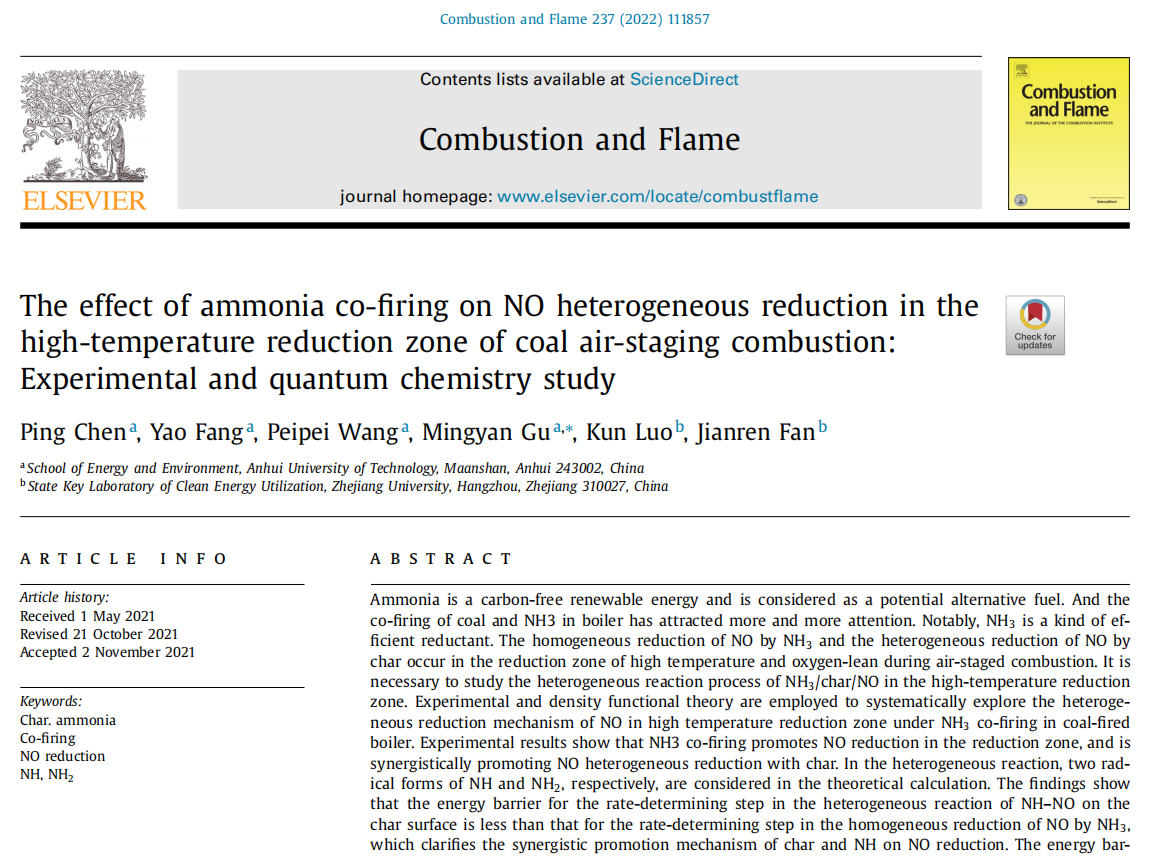 能源与环境学院青年教师陈萍在燃烧领域国际权威期刊《Combustion and Flame》上,以第一作者身份发表了题为“The effect of ammonia co-firing on NO heterogeneous reduction in the high-temperature reduction zone of coal air-staging combustion: Experimental and quantum chemistry study”的论文。该论文通讯作者为能源与环境学院顾明言教授,合作者为浙江大学能源工程学院樊建人教授和罗坤教授。晋江文学城