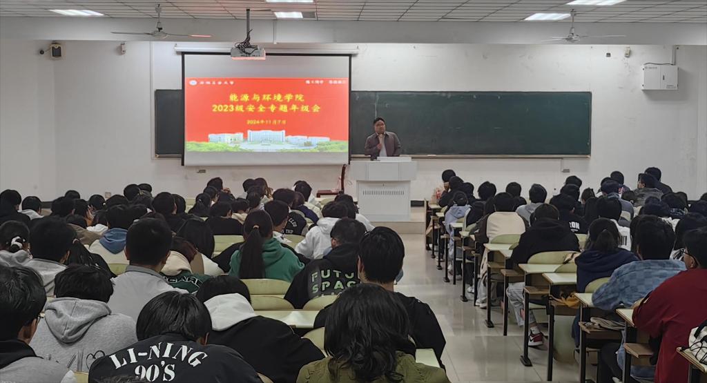 于教三103教室召开2023级学生安全专题会。院党委副书记、纪委书记、副院长卫军帅主讲,2023级辅导员费丽、周虹晶及全体学生参与。