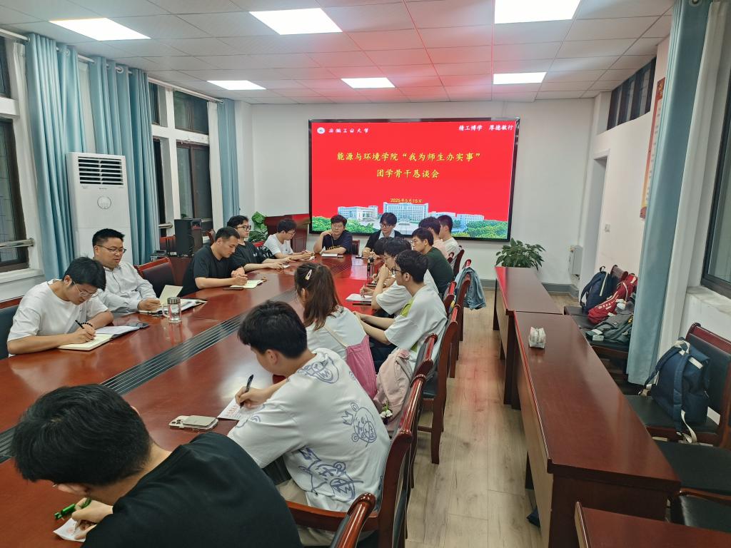 5月15日晚,能源与环境学院在能源楼325会议室召开"我为师生办实事"团学骨干恳谈会。学院党委副书记、副院长卫军帅出席会议并与学生座谈交流,会议由院团委书记沈厚发主持,相关老师及主要团学骨干参会。