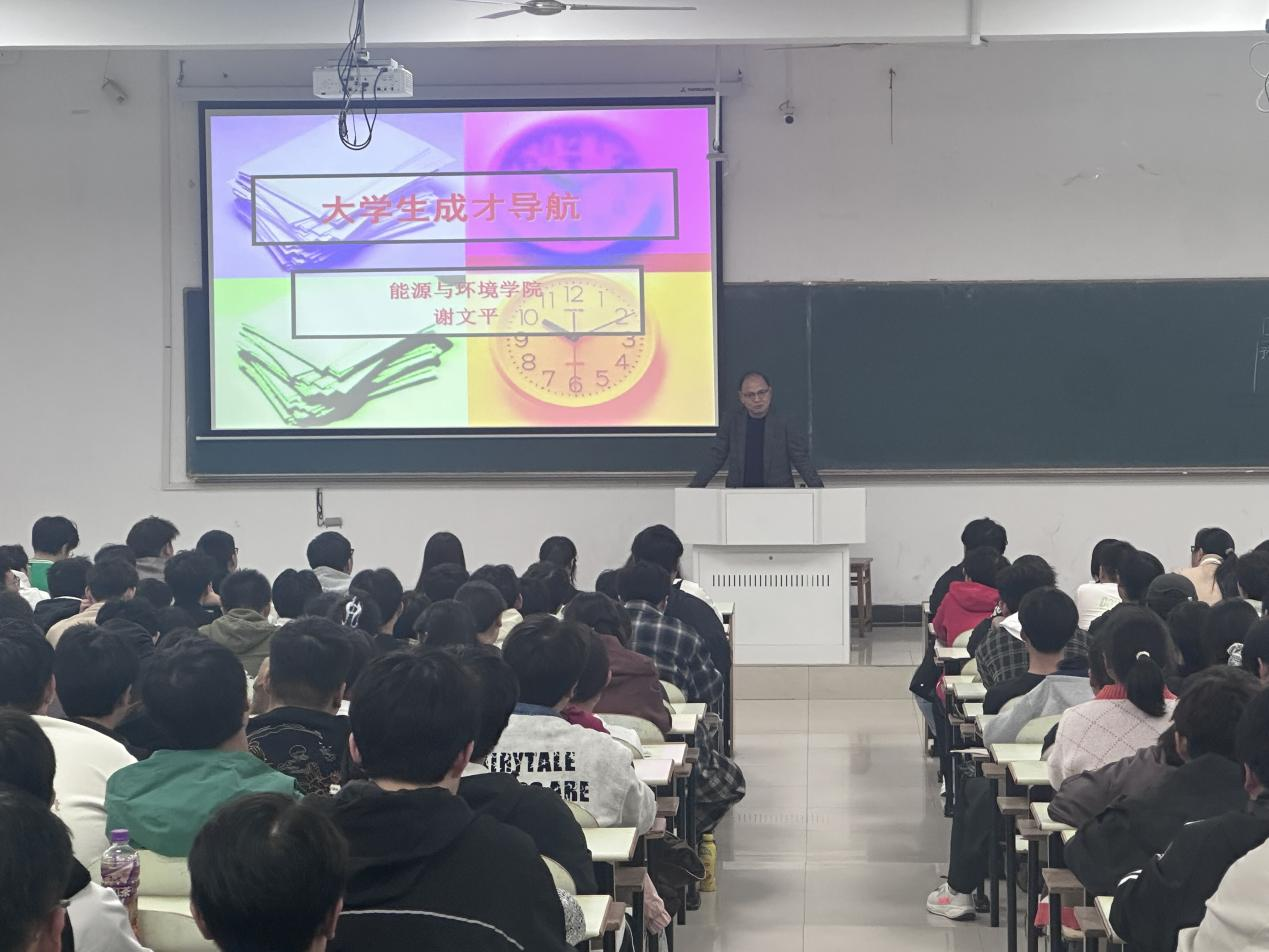 为了帮助2025级新生尽快适应大学生活、明确学业方向、树立成长目标,能源与环境学院于2025年10月21日晚在教三南203教室举办了“大学第一课”成才导航讲座。本次讲座由学院党委书记谢文平主讲,围绕大学认知、学业规划与成长发展等内容,为新生带来了一场深刻而温暖的入学引导。