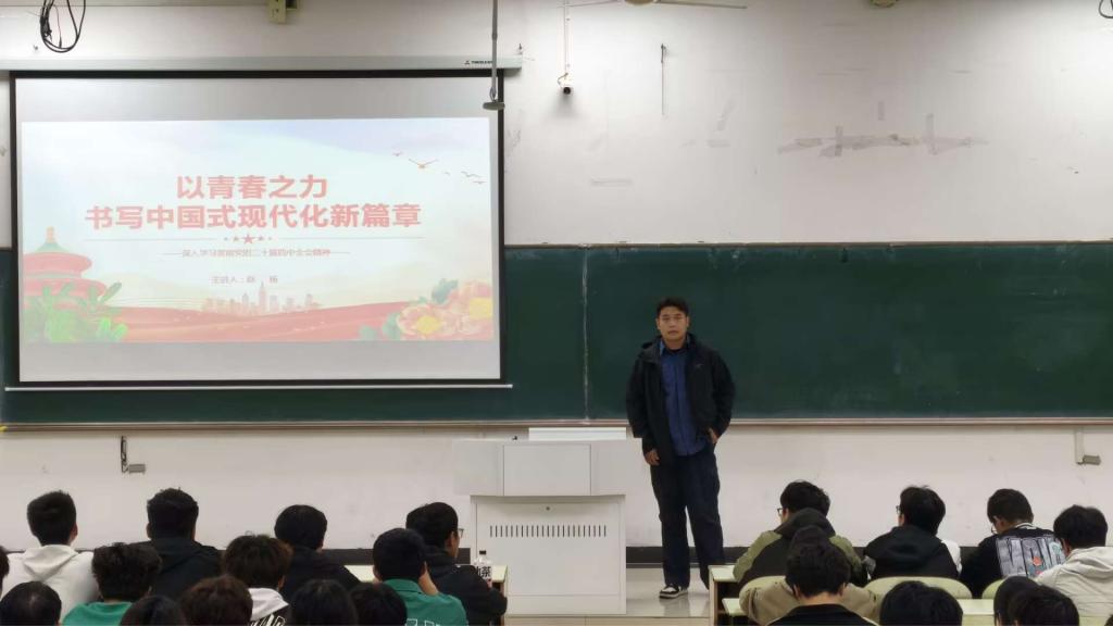 为深入学习贯彻党的二十大精神,引导新生深刻领会新时代党的历史使命与战略部署,坚定理想信念、明确奋斗目标,10月26日晚,能源与环境学院在教三南203教室面向2025级全体新生开展了党的二十届四中全会精神学习及习近平新时代中国特色社会主义思想专题宣讲。本次宣讲由2025级辅导员赵杨主讲,学院全体新生共同参加。
