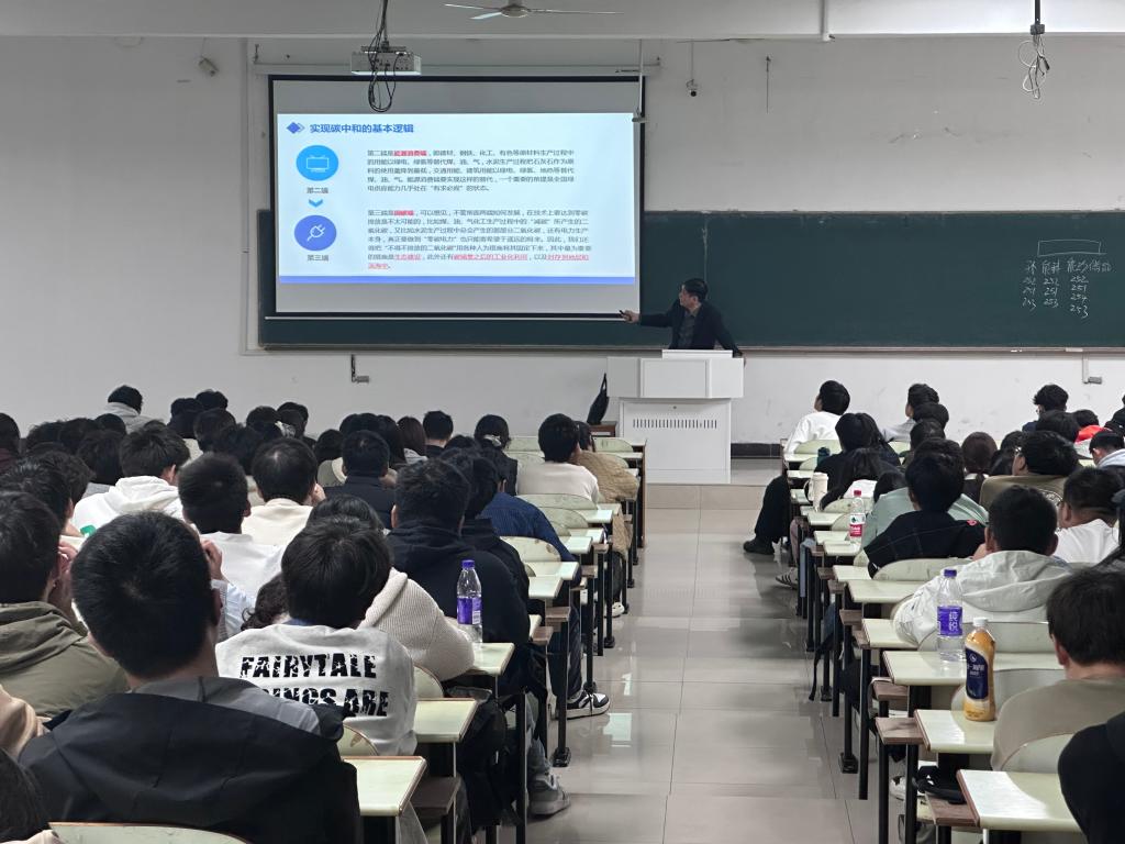 其次,钱付平结合专业实际应用,向同学们生动介绍了能源电力系统的构成与多种电力供应方式,重点讲解了太阳能、风能、氢能等清洁能源技术的发展现状,以及“电转燃料”等前沿技术如何有效降低能源损耗、提升能源利用效率。他通过具体案例,展示了能源与环境学科在推动能源结构转型、实现能源清洁化方面的关键作用。