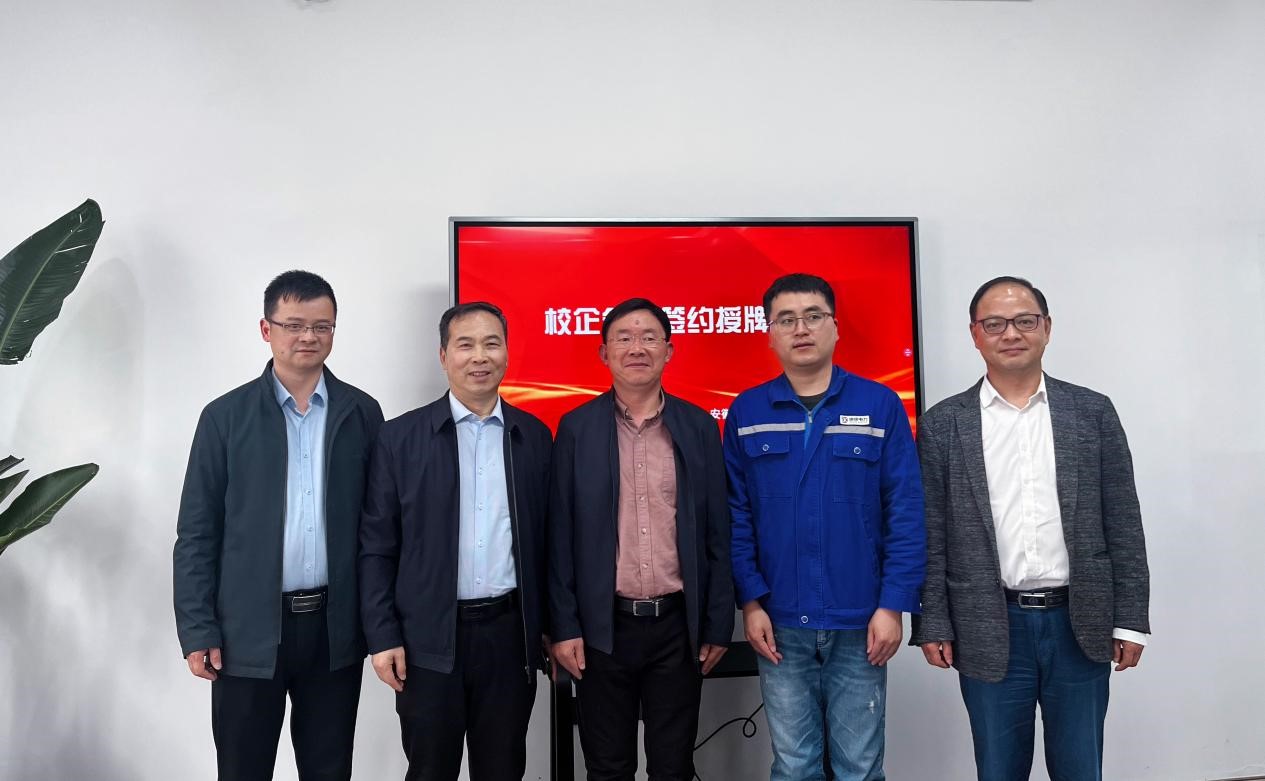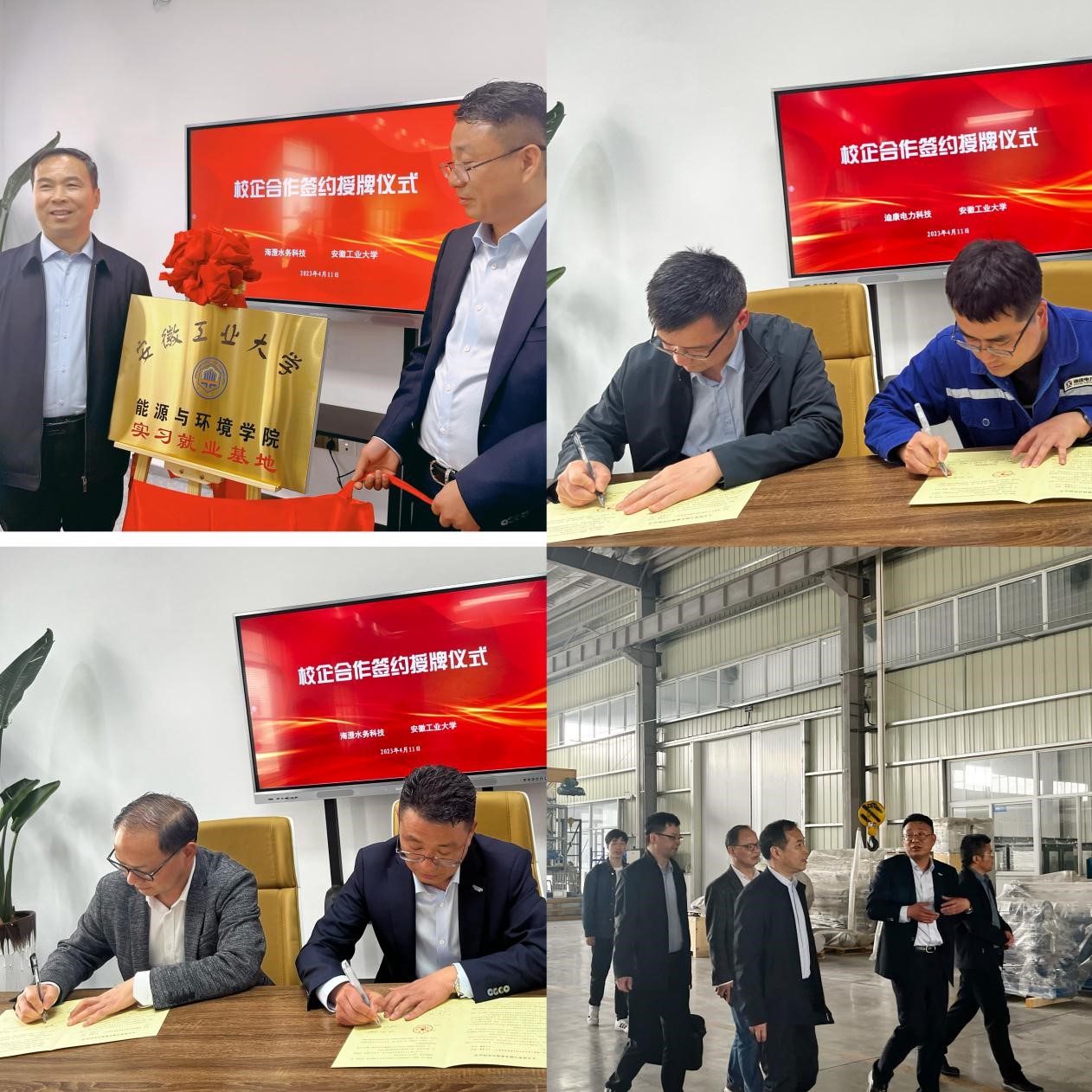 能源与环境学院产学研合作基地”揭牌。学院党委副书记谢文平和教学副院长盛广宏分别与四家企业签订了大学生就业基地协议和实习基地协议。与会人员在企业负责人的陪同下一同参观了海澄水务科技集团有限公司和东方日升(安徽)新能源有限公司生产车间。