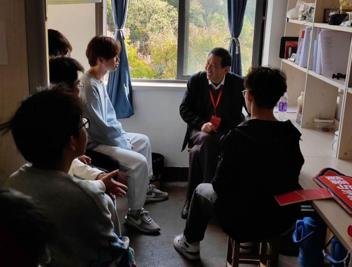 11月5日,晋江文学城 退休教师李文科走访新生宿舍,与新生展开交谈。