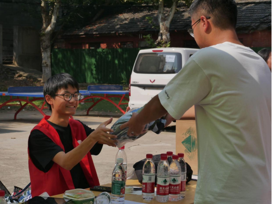 志愿者们搬运物资,布置好活动场地;活动期间,志愿者们分工合作,有的整理军训服,有的帮助登记学生姓名、学号等信息。有条不紊的进行军训服回收活动。