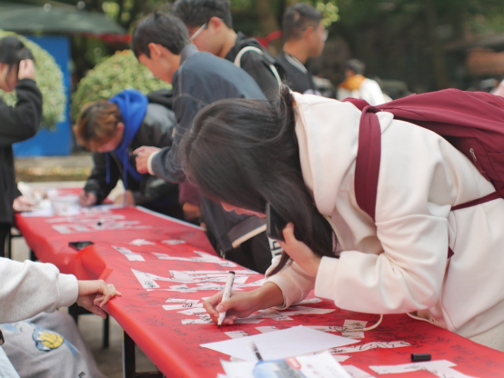 志愿者们提前准备物资、布置好活动场地,轮流值班,同时引导同学们在横幅上签字。在此期间,志愿者们积极宣传关于传销案例以及新型毒品类型,号召同学们抵制毒品、拒绝传销,宣传正确的价值观和人生观。